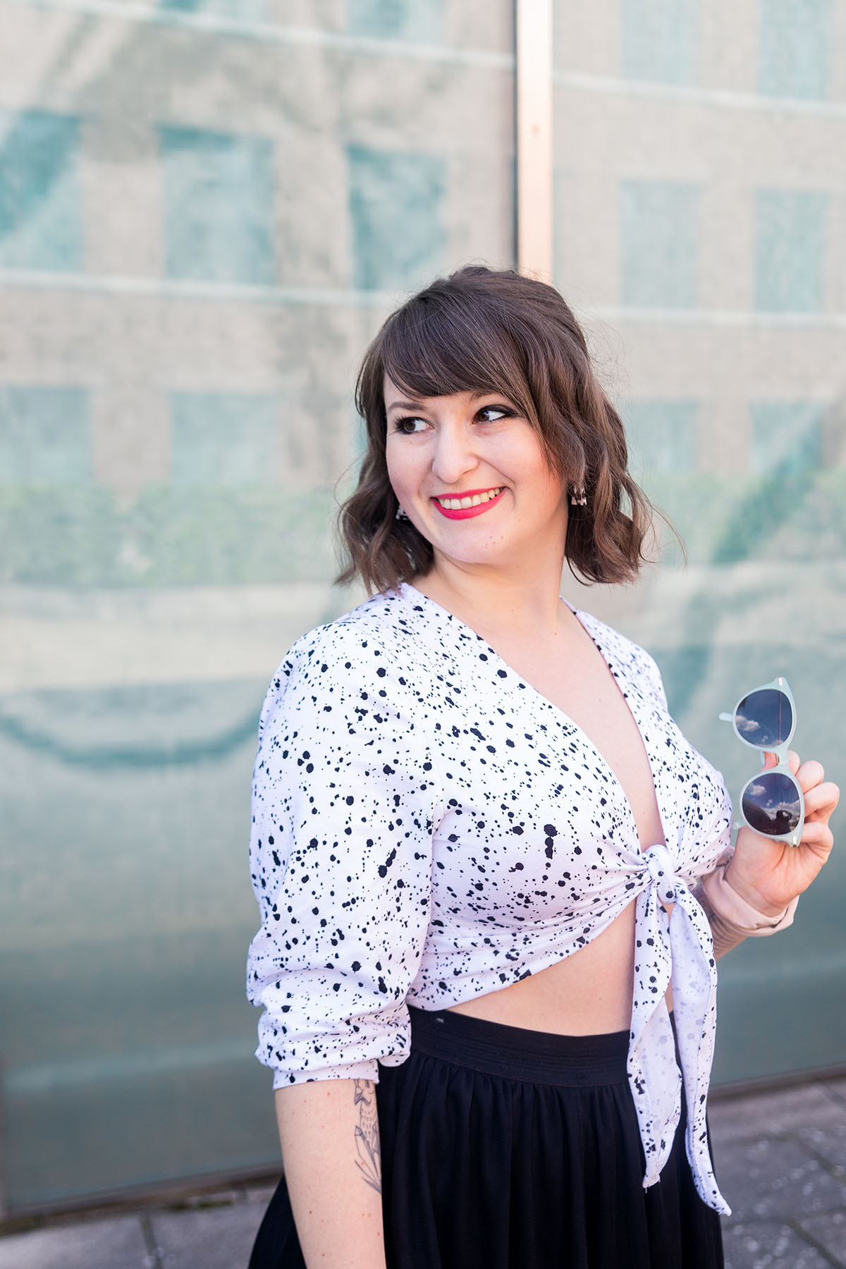 Also bin ich auf dieses Knotentop umgeschwenkt, das ich ziemlich freestyle genäht habe – und zwar aus einem Stoff, den ich noch da hatte. Und ich liiiebe es! Ich finde das Knotendetail vorne so cool und bin nun sehr froh, dass ich a) den Stoff aufgebraucht habe und b) so ein tolles neues Kleidungsstück hab. 🙂