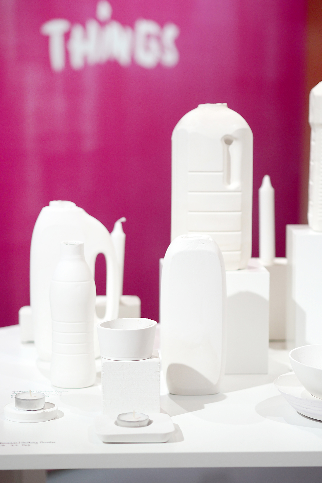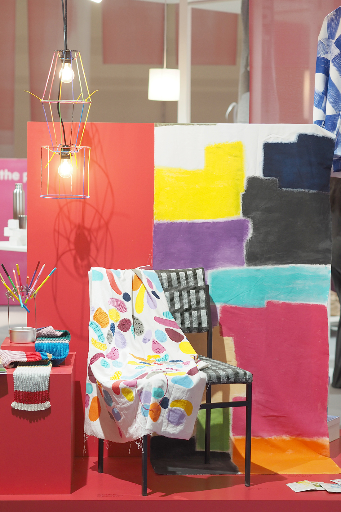 Ebenfalls eine Rolle spielen traditionelle Techniken, die mit neuen Materialien kombiniert werden – Shibori auf Papier oder Recyclingideen wie Plastikstreifen und PET-Flaschen, die mit DIY-Material zusammen gebracht werden.