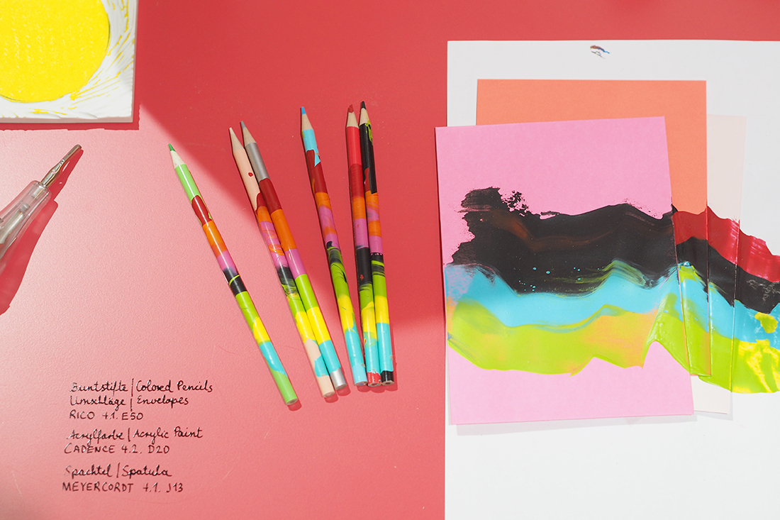 Die Farbpalette beinhaltet intensive Töne wie Magente, Gelb, Cyan, Orangerot, Azur, Violett und Smaragd. Diese Farben werden mit groben Pinselstrichen und Texturen aufgetragen, gestempelt oder mit Schablonen auf den Oberflächen angebracht. Pinselstrich-Optik finde ich persönlich immer toll.