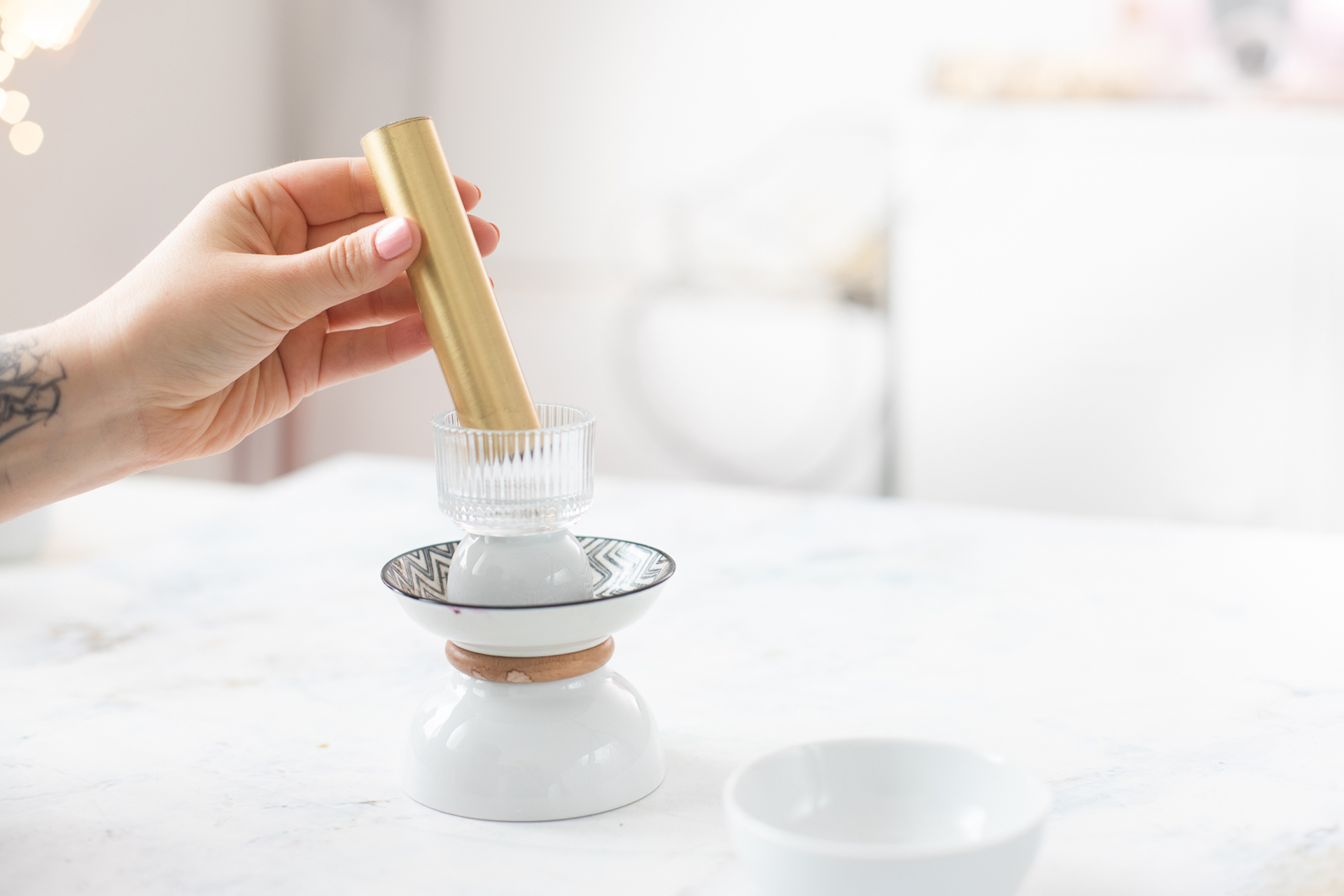 1. Im ersten Schritt probierst du aus, wie die Schälchen sich schön zum Kerzenhalter stapeln lassen. Besonders gut sieht es aus, wenn du verschiedene Größen und Texturen abwechselst.